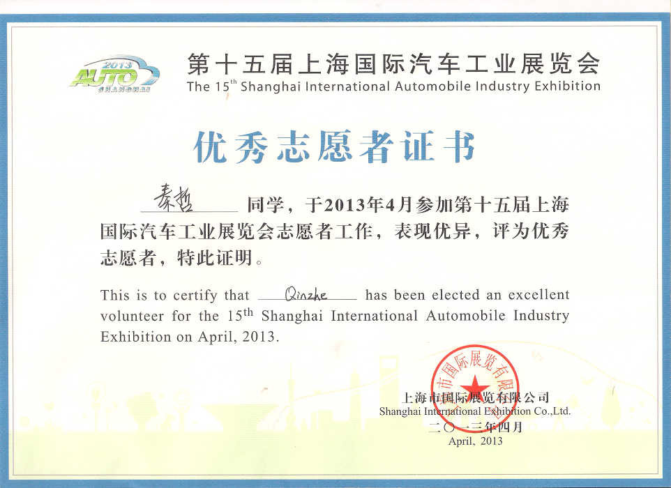 作为唯一一名通过面试的大专学历志愿者,在10天的志愿活动中,秦哲同学与来自华东政法大学,同济大学,上海理工,上海师范等高校同学一起进驻车展所在的上海新国际博览中心,在展览期内,协助完成现场监管事宜,全天候提供文明宣传、交通引导、接待等志愿服务,用专业知识,流利的英文和服务热情担当上海高校的车展服务监管工作的一员。
