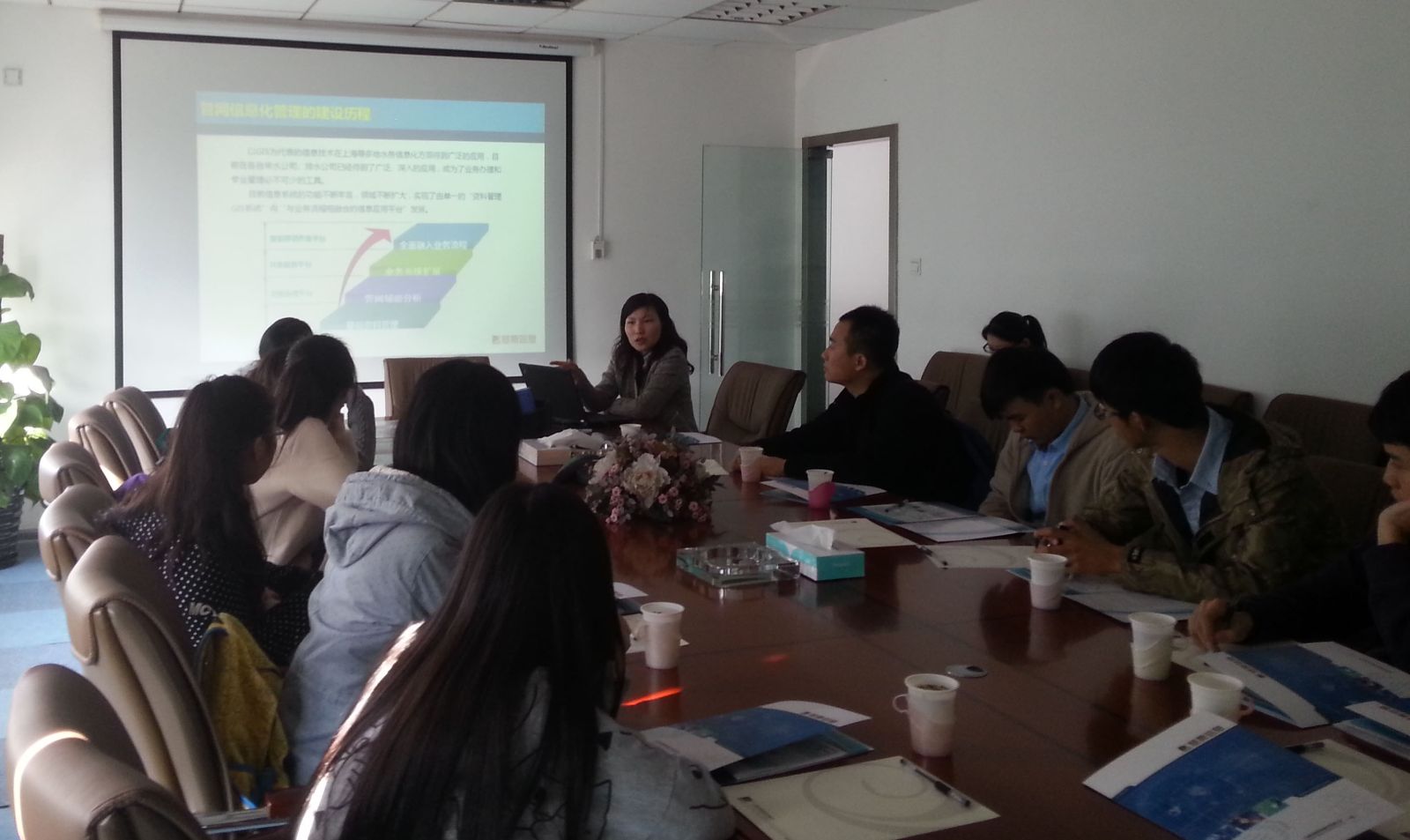 公司副总经理首先给同学们介绍了GIS在水利信息化上的应用,介绍了从建设水利信息化成果数据库、建设水信息应用平台、并将移动GIS技术应用于水利信息化,形成从数据采集、处理、建库到综合应用的数据链的水利信息化完整体系建设流程。接着,工程师给同学们演示了水利信息系统GIS应用平台,借助GIS突出的可视化功能和强大的分析功能,不仅从空间上、时间上实现对水利基础设施与水资源的现状与变化发展的彻底了解,还可以实现对水利基础设施和水资源的规范管理,便于各级水行政部门开展防汛指挥与决策、水情监测与管理、水利基础设施与水资源管理等多方面的工作。