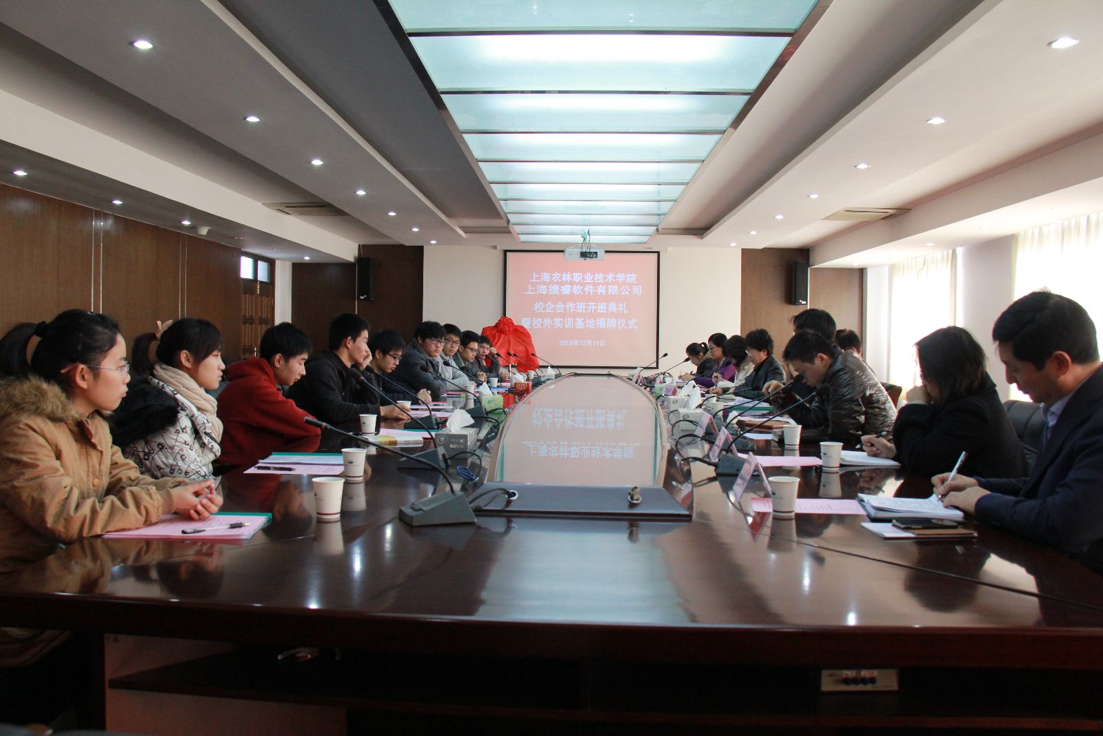 12月10日上午,校企合作“捷睿软件班”开班典礼暨校外实训基地揭牌仪式在1101会议室举行。院长魏华,校企合作办、宣传处处长、教务处负责人、农信系主任、相关教师、10名入读该班的学生,上海捷睿软件有限公司王坚剑总经理、陈皆欢副总经理出席了典礼。校企合作办主任辛雅芬主持仪式。