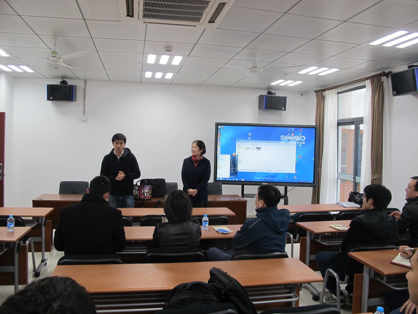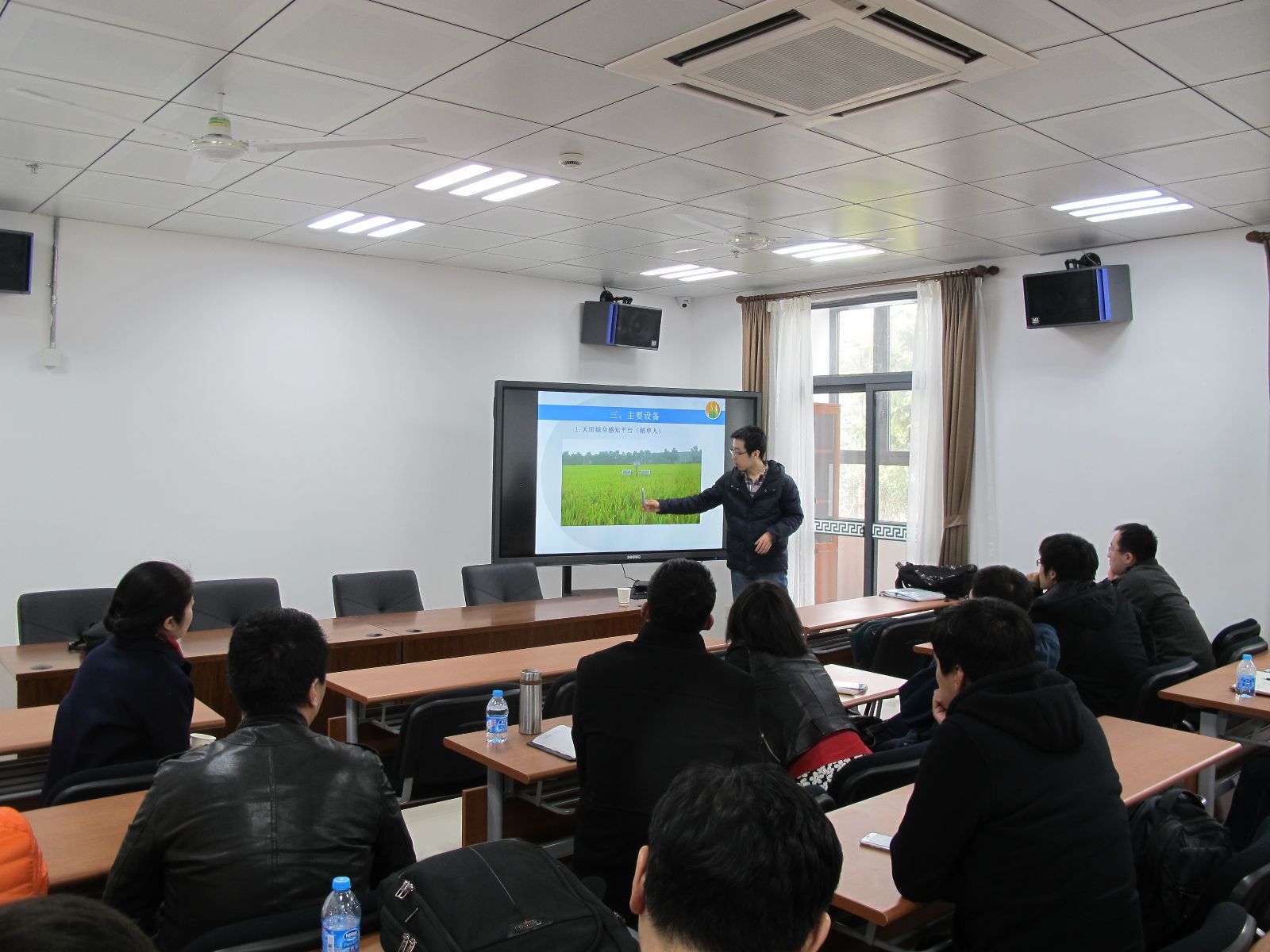 本次参加培训的共20位员工,来自上海农业信息有限公司和上海农易信息技术有限公司(以下合称农信公司),其中绝大多数是来自农信公司下属的农业物联网工程研究中心的新员工。此次培训前后持续了6个小时,课堂讲授与实地参观向结合,培训内容涉及企业文化、项目部署、农业物联网技术讲解和功能展示,我院农信系耿铭慈老师也参与其中。