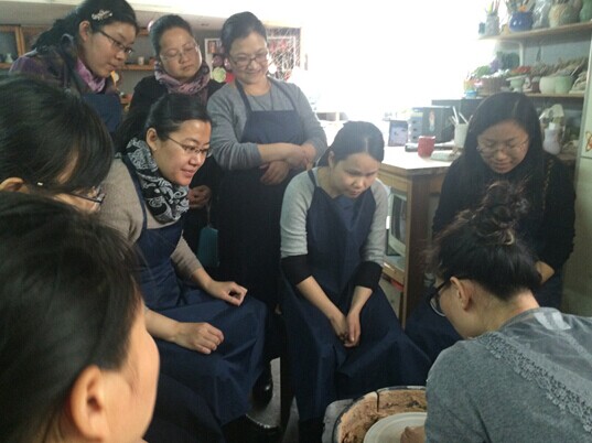 大家围坐一圈,认真听手工老师教授制作要领,拉胚、捏泥、粘贴,一点点地学,一步步地做,活动中笑声不断。一团团不起眼的泥巴在心灵手巧的姑娘们手里发生了奇异的变化,把我们的作品放在一起也能成为一个小小的展览了。