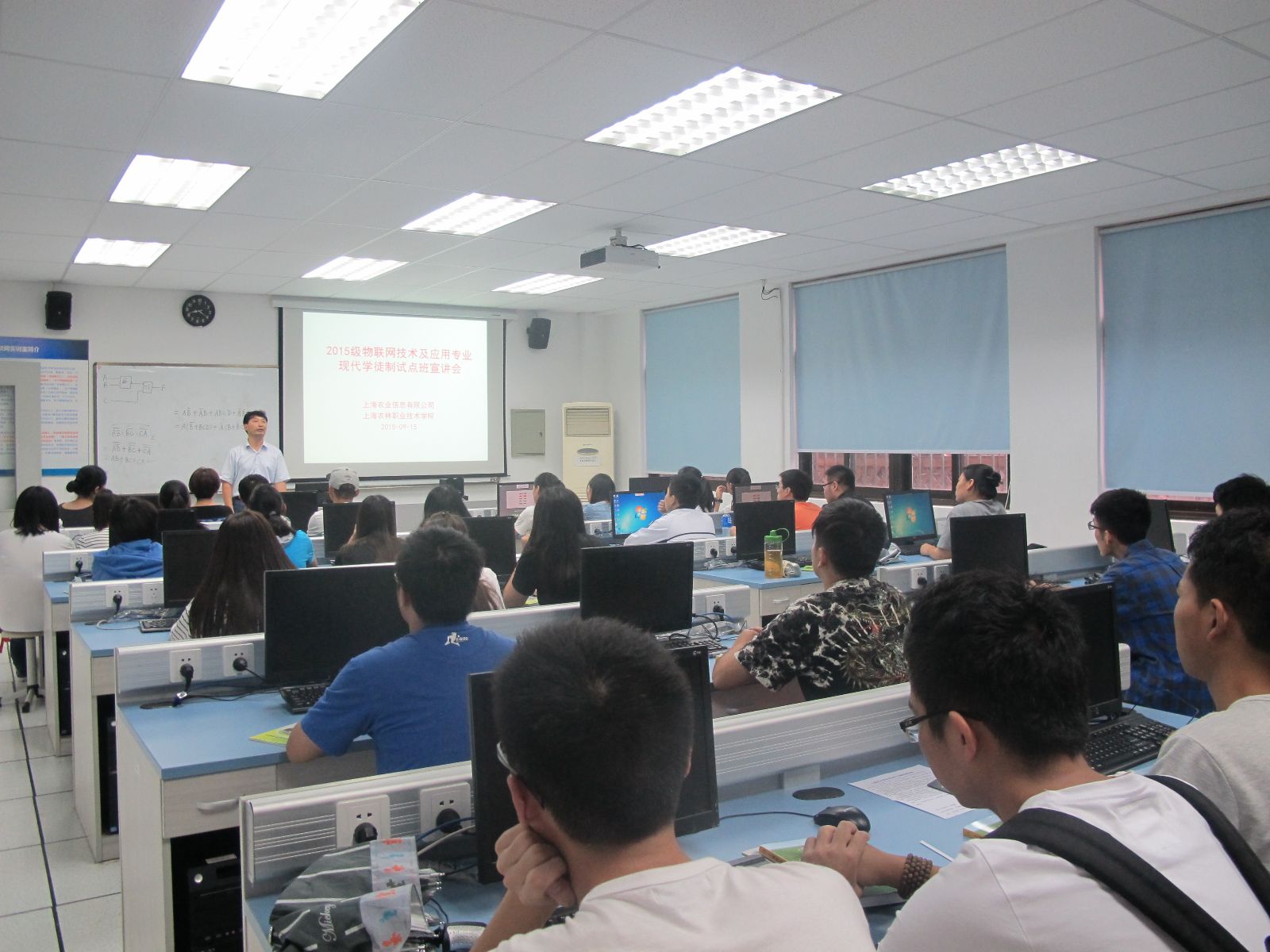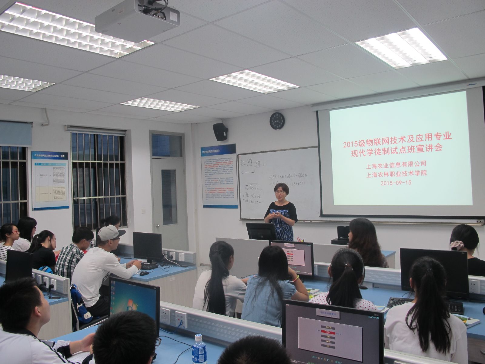 9月15日,上海农业信息有限公司(简称农信公司)就在2015级物联网应用技术(农业物联网技术)专业组建现代学徒制试点班招生宣讲会顺利开展,农信公司副总经理、行政人事总监金阳、农信公司人力资源部经理张慧及学院校企合作办主任辛雅芬和农信系师生参加宣讲会,农信系主任孙修东主持。