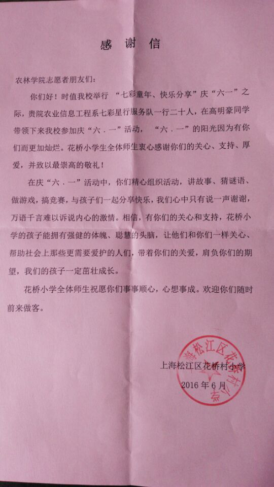 近日,松江区花桥村农民工小学向学院发来感谢信,感谢农信系七彩星行志愿服务队在庆六一志愿服务活动中对花桥小朋友们的真挚关爱。感谢信全文如下: