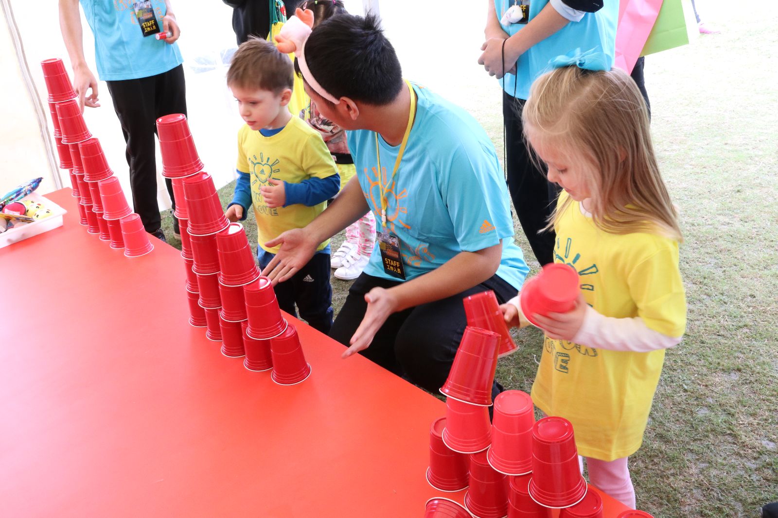 活动中,志愿者们一丝不苟地执行各自的工作任务,整个园区里都能看到他们活跃的身影,有的在游戏区为游客讲解游戏规则、有的在DIY区为小朋友提供技术指导、有的在长跑区为参赛者加油呐喊。