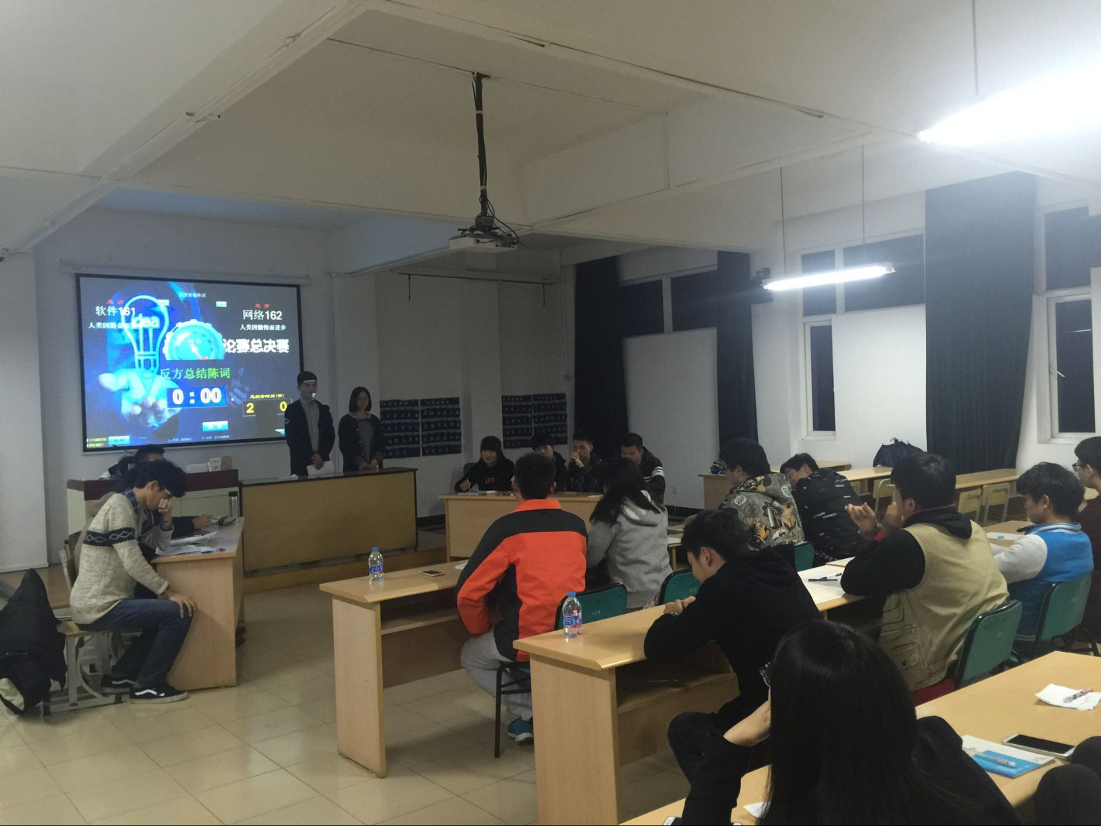 比赛共分为六个环节。赛场自主持人喊下开始的那一刻起就变得紧张又激烈,双方辩手针锋相对,唇枪舌剑,你来我往,却又不失风度,侃侃而谈。尤其是在最精彩的自由辩论环节,现场气氛迅速升温,精彩不停掌声不断。继短暂而精彩的观众提问环节后,比赛进入总结陈词环节。正反双方辩手清晰的思路和巧妙的陈词给观众留下了深刻印象。随后指导老师郑英羽对本次辩论赛做了精彩的点评,她指出了双方的优点和不足,并表示期待大家的进步。最后,比赛以正方软件161班获胜而告终,反方二辩获得了最佳辩手的荣誉称号。