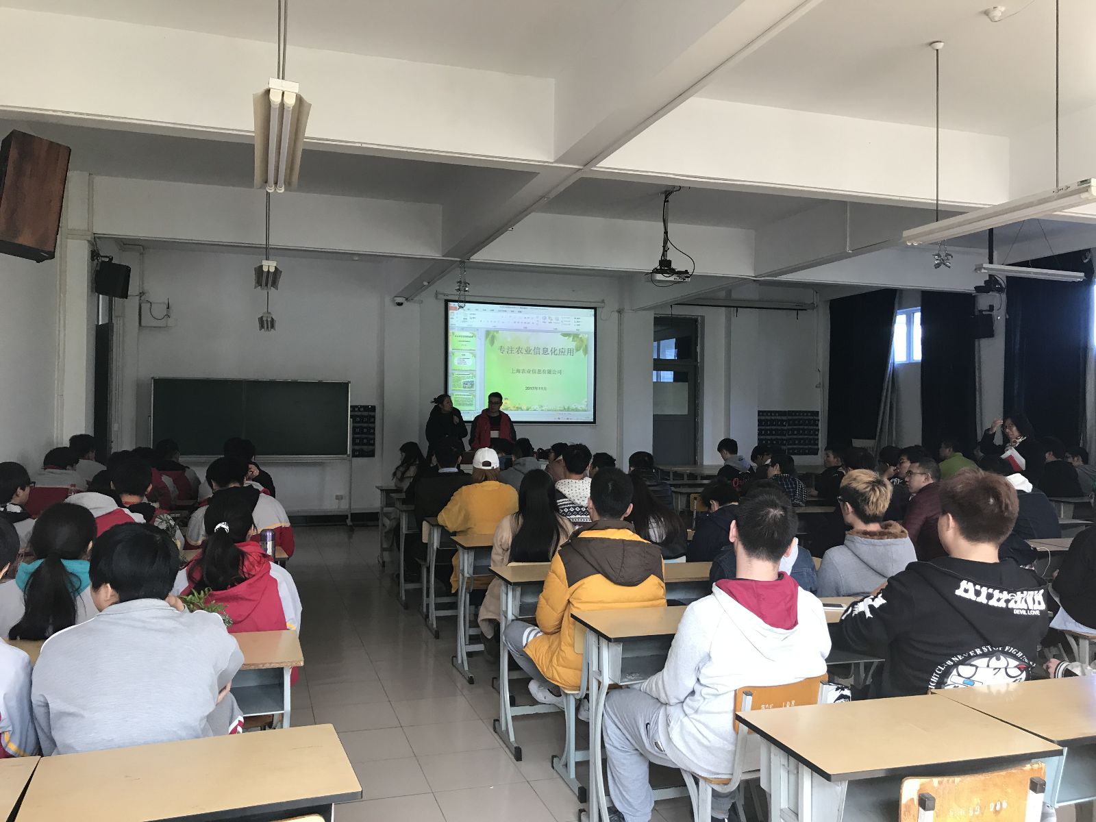 在交流提问环节,我院软件班级的学生针对专业问题进行了提问。就平时学习中遇到的问题与施学长进行了热烈的交流和讨论。一个小时的讲座,施金垒点面结合,理论结合实际,为大家理清了设施农业应用的思路,对我系学生开展就业实习有实际指导意义。