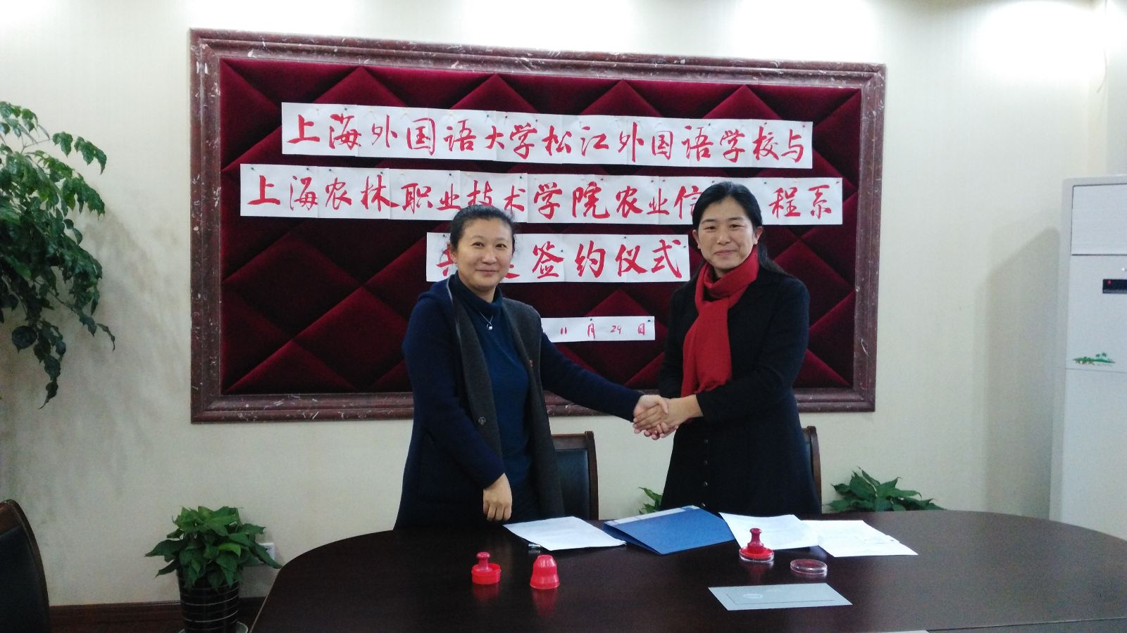 为深入贯彻习近平总书记系列讲话精神,全面落实共青团中央、教育部联合印发的《中学共青团改革实施方案》、《高校共青团改革实施方案》、构建大、中学联动的新格局、农信系积极与松江区中学接触,探索开展活动的方式。经过努力,我系团总支于11月24日上海市城市科技学校智能工程系签订共建协议。11月29日我系与上海外国语大学松江外国语学校教务处签订共建协议。通过共建开展交流活动不断提高各自学校团学活动的质量。我系将在上海市城市科技学校智能工程系开展农业信息技术推广活动、农耕文化推广活动。在上海外国语大学松江外国语学校八年级学生中开设一门农业类选修课程。
