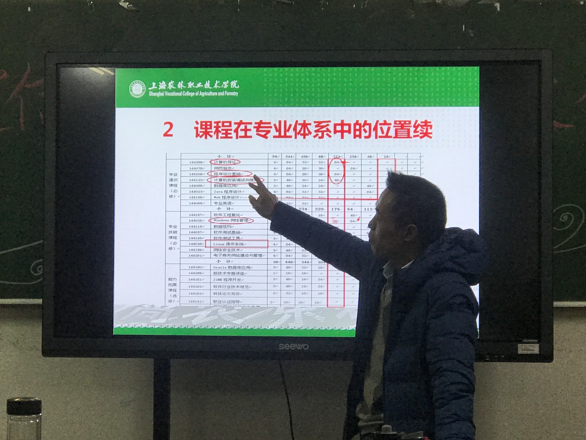 继教研室主任说专业人才培养方案后,2018年3月23日,在农信楼201室室,农信系举行了本学期的第一次教师说专业课活动,作为本学期的教研日活动之一,来自软件技术、网络技术、设施农业与装备专业的3个教研室共17位老师参加,说课包括15门专业必修课、专业基础课和2门公共基础课,每周教研日活动安排2位老师说课,从第3周~第16周。
