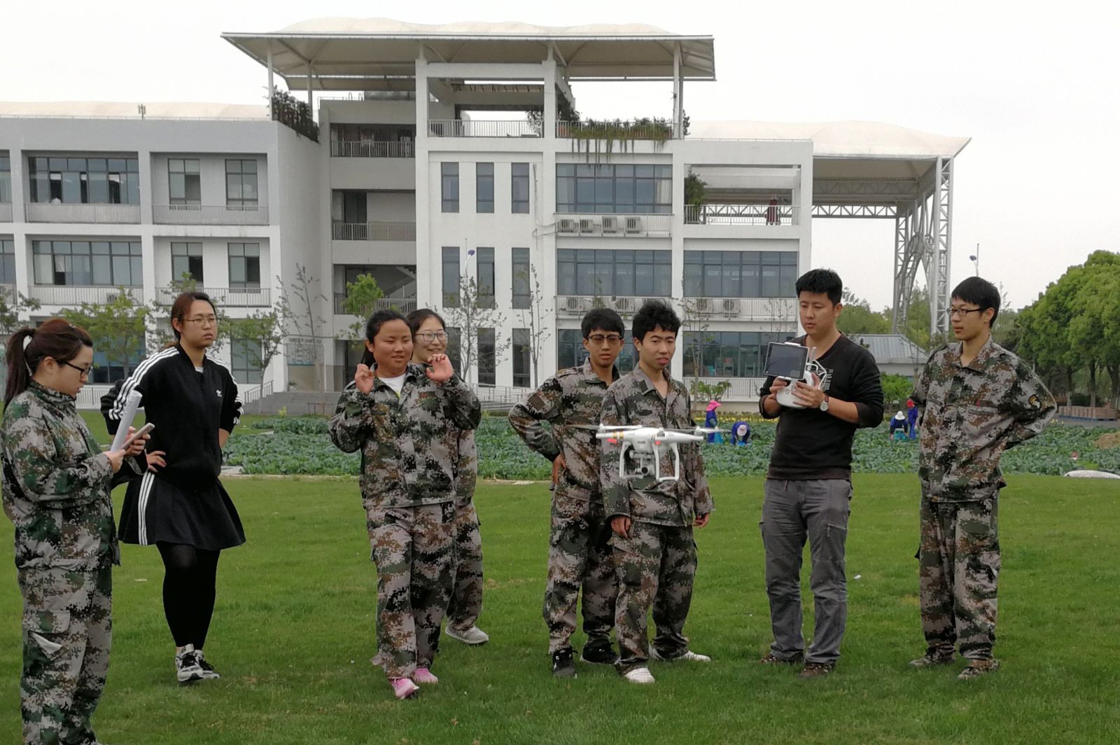 学生们根据教师讲解、培训引导和群体互动,一一亲身体验了小型无人机的飞行控制和信息获取技术。同学们亲手操作飞机在设施园区和大田上盘旋监测,对五厍基地生产园区的大田、水产养殖区、设施园艺生产区等环境进行了中低空实时、高清预览,并根据航路预判,控制点选取,沿指定航路对地面具体地物进行定向信息采集、全向360°观测,不仅提升了学生们对农业信息采集技术及传感相关领域知识的认知能力,而且在原有地面预设传感器和监控器采集生产信息、监控农业资源的基础上,使用当前流行的无人机技术,让学生亲自体验手操,并参与讨论和目标规划,让学生在室外真正地“动”起来。据同学们说,最大的乐趣和突破在于,低空观测摆脱了传统地面监测的视角局限,操纵无人机低空盘旋能够对地面目标进行区域性遥测、全局性监控,结合地面端物联网设备的无线遥控,视觉效果提升明显。