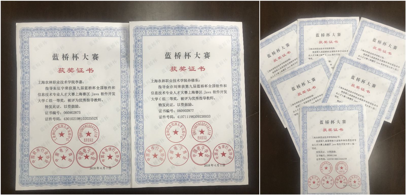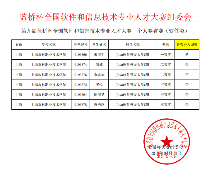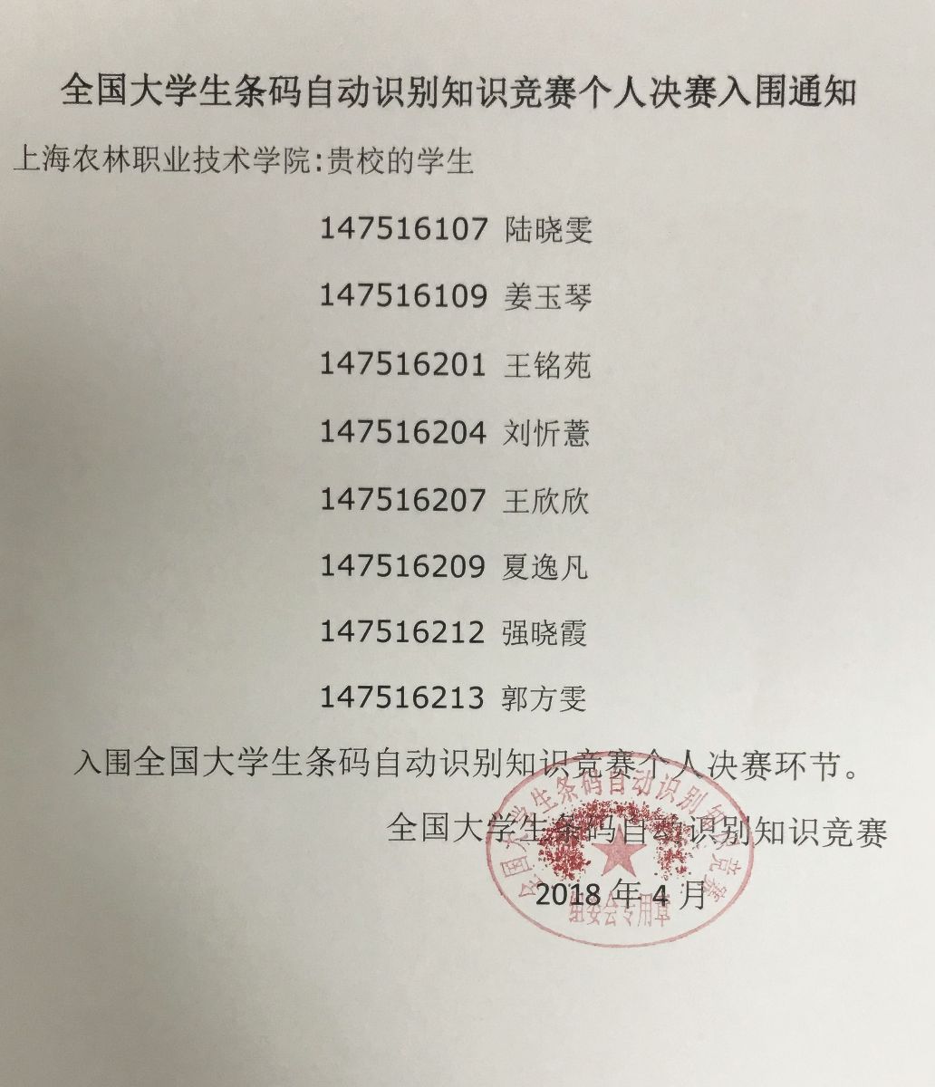 经过层层挑战,选手们表现优异,纷纷入榜:张雪峰同学获得ICT大赛一等奖,朱征宇同学获得JAVA大赛一等奖且成功入围全国总决赛,另有陆诚、金亦刘、董浩然、王悦等同学分获二等奖,陈倪昊、祝浩然、王晋文、钱宇新等获得三等奖;此外,陆晓雯、姜玉琴等8同学也在全国大学生条码自动识别知识竞赛初赛中为我院争创佳绩,并入围个人决赛。