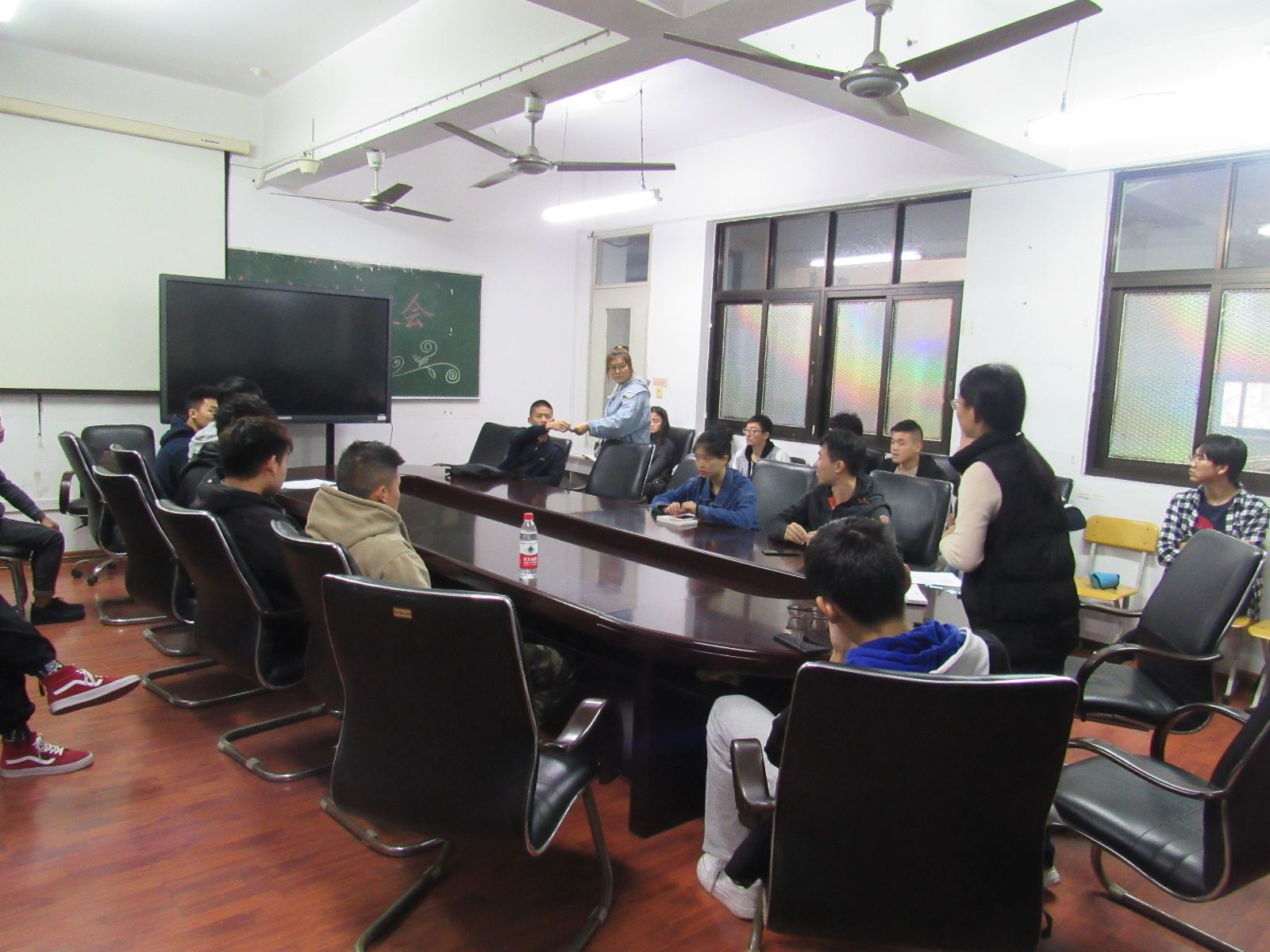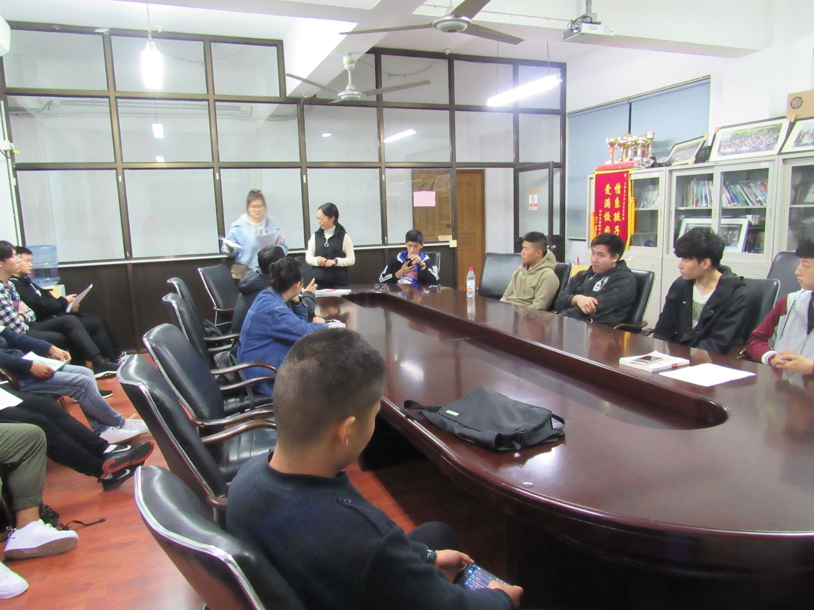 随后文艺部负责人董晓蝶安排退伍学生进行抽签确定最终结对的18级班级,又通过抽签安排了合唱比赛的出场顺序。会议的最后,12名退伍学生与结对班级文体委员交流了下一步的工作安排。