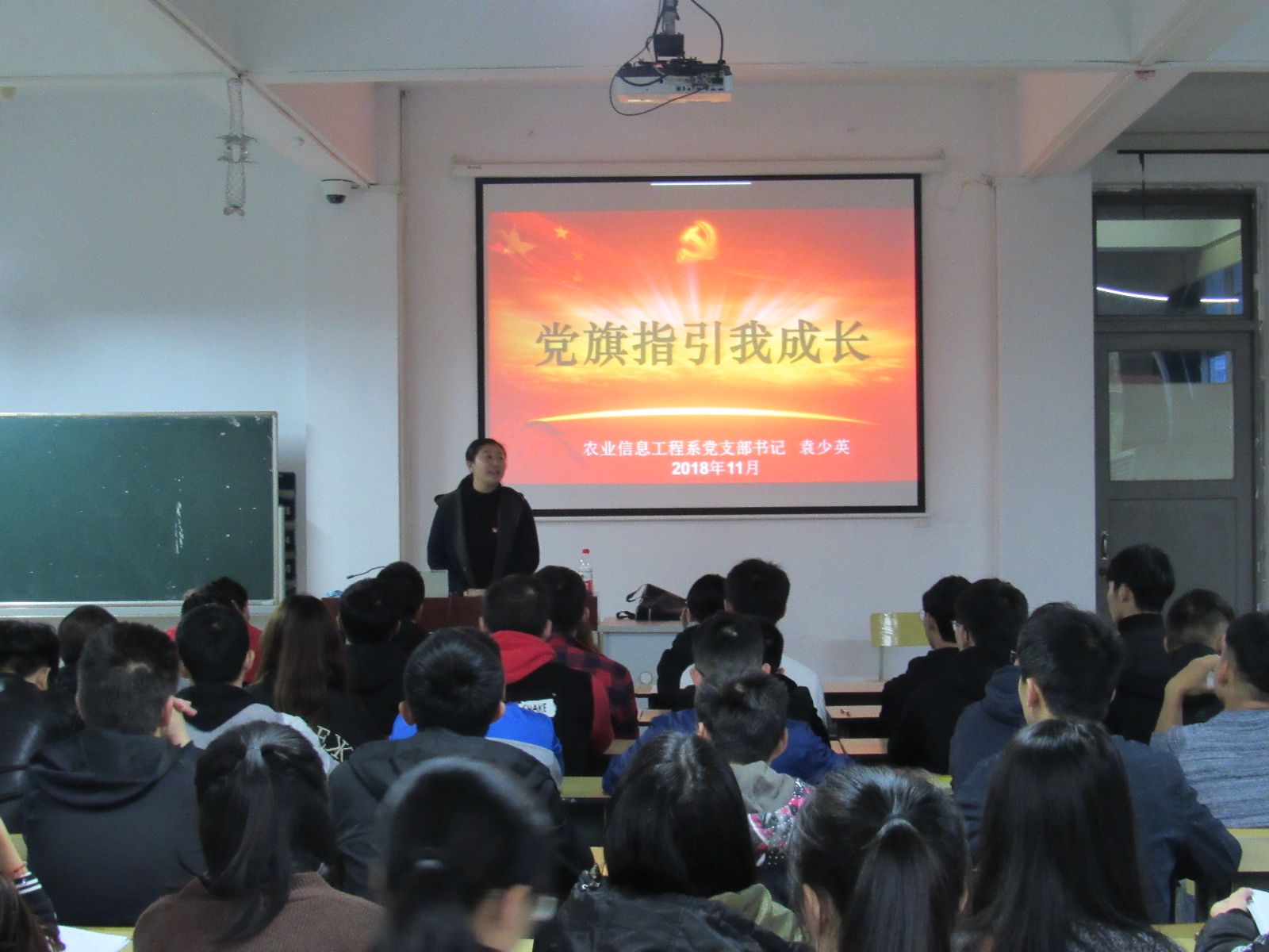 2018年11月12日下午4点,农业信息工程系党支部在一教315开展了“党旗指引我成长”党课。农业信息工程系党支部书记袁少英同志主讲,17级入党积极分子和18级递交入党申请书的新生约90名同学参加了此次活动,党支部组织委员王璐老师做了会议记录。