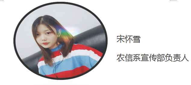 宋怀雪,目前担任软件172班易班班长和农信系宣传部负责人,主要工作是配合系团总支学生会各部门的学生活动,做好活动的海报宣传、背景制作,宣传教育同学,引导鼓励同学参加学生活动。负责各部门活动拍照。