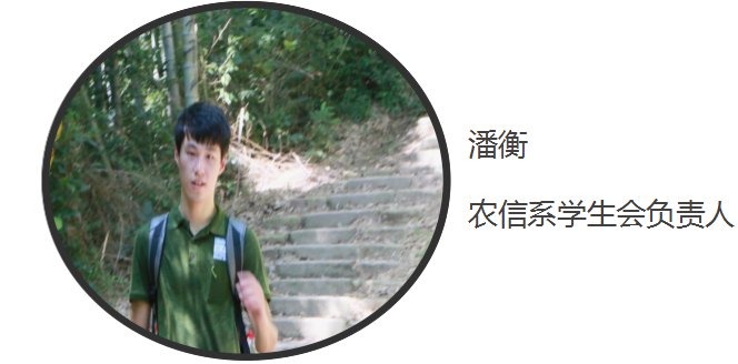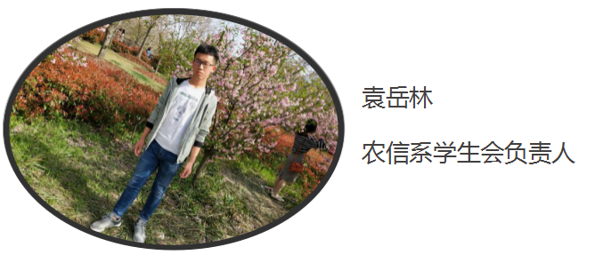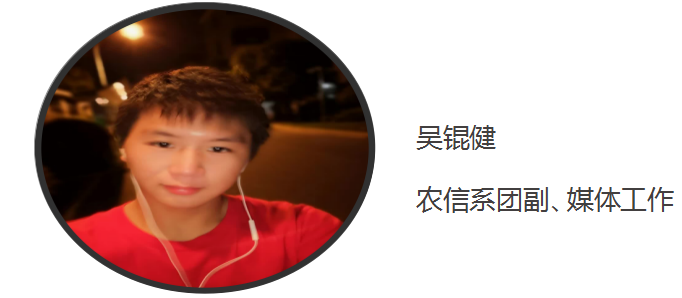 吴锟健,网络171班宣传委员、农业信息工程系团副、媒体工作部负责人。主要负责新媒体平台上宣传阵地建设及校内新闻传递,协助系团总支老师开展工作;积极发现拓宽同学们获取信息的窗口,拟明年三月前搭建完成青春农信的信息窗口。平日里喜欢发现实现一些好的idea,有想要实现一些小想法的小伙伴可以call小哥哥哦。