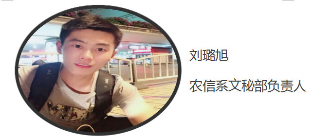 刘璐旭,目前担任农信系文秘部负责人,工作认真努力、踏实认真。