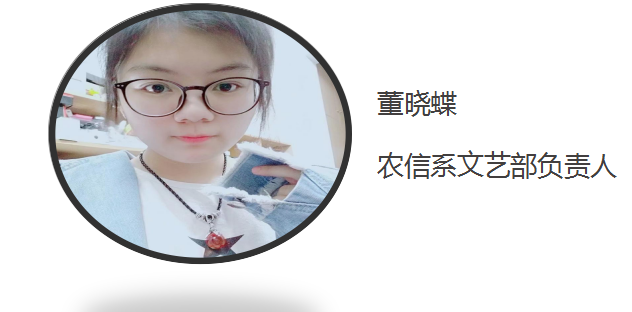 董晓蝶,农信系网络173班的学生,现任农信系文艺部负责人。在本学年组织大一同学举办了农信系红歌合唱比赛,并带领同学们参加了院部的校歌大合唱比赛,在红歌的经典旋律中感受到了红军的革命情谊。除此之外,文艺部还组织策划了网络182班对软件181班的联谊,增进了两班同学之间的友谊,促进了班与班之间的文化交流。