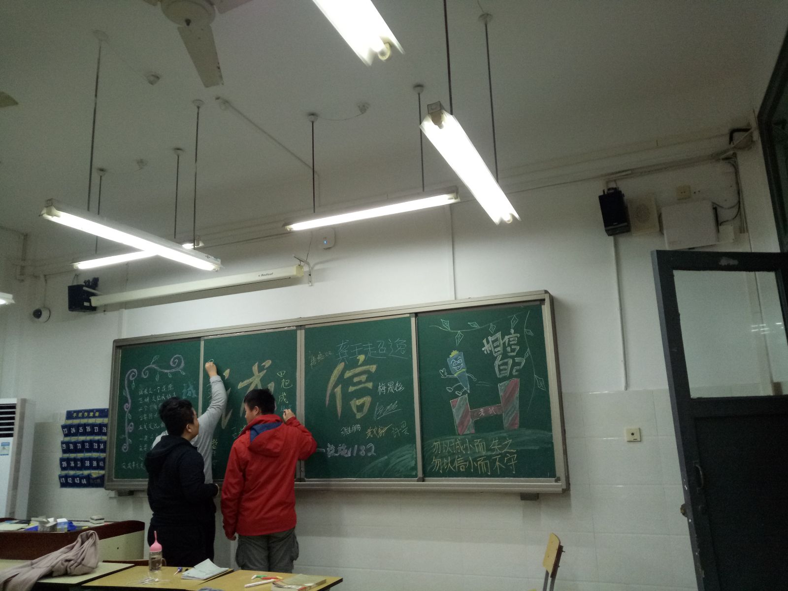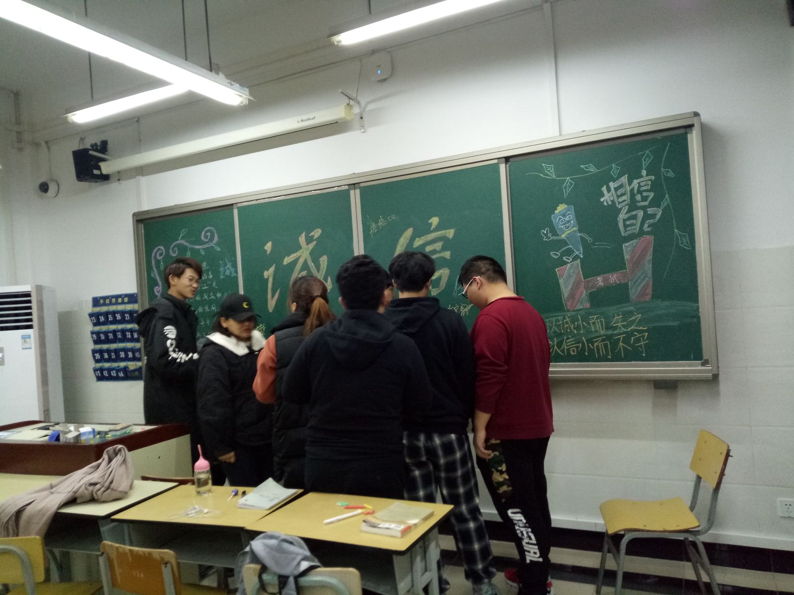 2018年12月16日,设施182全体学生在一教405教室举办了以“诚信考试,我们在路上”主题班会活动。本次活动的主要环节有诚信之见、情景描绘、全班宣誓。本次班会的主旨是无论是在学习考试中,还是在日常生活中,都要诚信、守信,铭记做人之本。