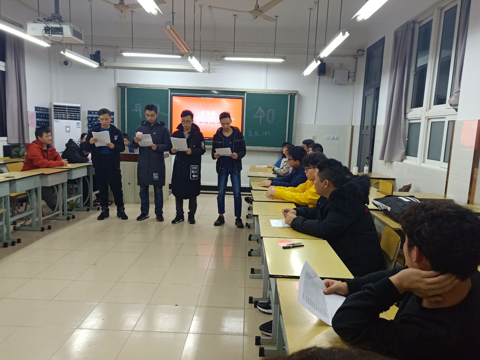 本次活动首先由主持人引出活动主题,然后由汪勐哲同学演唱一首《歌唱祖国》,同学们听的激情澎湃,更加坚定了努力学习,奋发图强的目标。接着由武文翔、顾涛、董杰、王明宇同学进行诗朗诵,庆祝改革开放40周年这一伟大的时刻;改革开放以来,中国特色社会主义进入新时代,使近代以来久经磨难的中华民族迎来了从站起来、富起来到强起来的伟大飞跃,迎来了实现中华民族伟大复兴的光明前景。接着由唐培红同学进行主题演讲,现场的气氛紧张又严肃,同学们都在回忆着改革开放之后的变化;紧接着由团支书通过一段小视频向全体人员诠释了改革开放,同学们也在这次活动学到了一定的知识,也增强了爱国意识。紧接着,同学们讨论对改革开放的认识,以及改革开放政策为中国特色社会主义社会所带来的重大影响和对自己家乡带来变化;之后是由主持人带动全班同学开展了一场知识小竞赛。结束了紧张刺激又好玩的知识竞赛环节,本次精彩的团日活动也接近尾声了;王泽众同学为本次活动做了总结。最后,由团支书带领全班人员进行宣誓。也宣告了本次团日活动圆满结束!