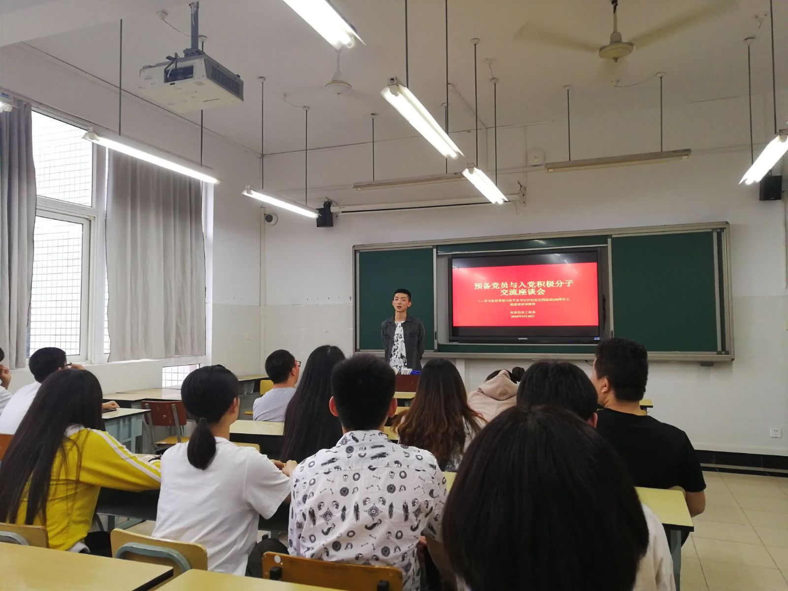为深入学习贯彻习近平新时代中国特色社会主义思想,激励和引领广大团员青年大力弘扬以爱国主义为核心的伟大民族精神,更加紧密地团结在以习近平同志为核心的党中央周围,树牢“四个意识”,坚定“四个自信”,坚决做到“两个维护”,矢志投身新时代夺取中国特色社会主义伟大胜利的新征程,根据院团委“青春心向党 建功新时代”纪念五四运动100周年活动安排,我系在5月26日晚6点在一教412举办了预备党员与入党积极分子交流座谈会。