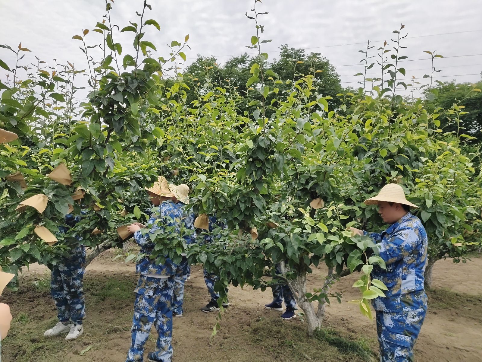 《基地生产实践》中,学习了梨树果的包保护套,听完老师的讲解我们也基本了解到保护套的重要性,并且听老师说一个熟练的工人一天可以包2000多个,但工资仅120,这种高劳动低收入的工作非常累,面朝黄土背朝天,让我们不禁感叹。老师细心交完包果技术,同学们便跃跃欲试,迅速分组,各司其责,轮流分工,拿了一打又一打的包扎袋,从一开始的笨拙到熟练,还有同学调侃说“我这速度,一天120都没有”我们听完止不住哈哈哈大笑起来。在欢乐的氛围中,即便是烈日当头,我们也是毫不畏惧,不知疲倦的劳作。最后大家看到通过的双手,梨树上裹上一袋袋保护套,都感慨农民伯伯的不易。离去时,同学们依依不舍,虽然脸上有一丝疲惫,但更多的是满足与开心。