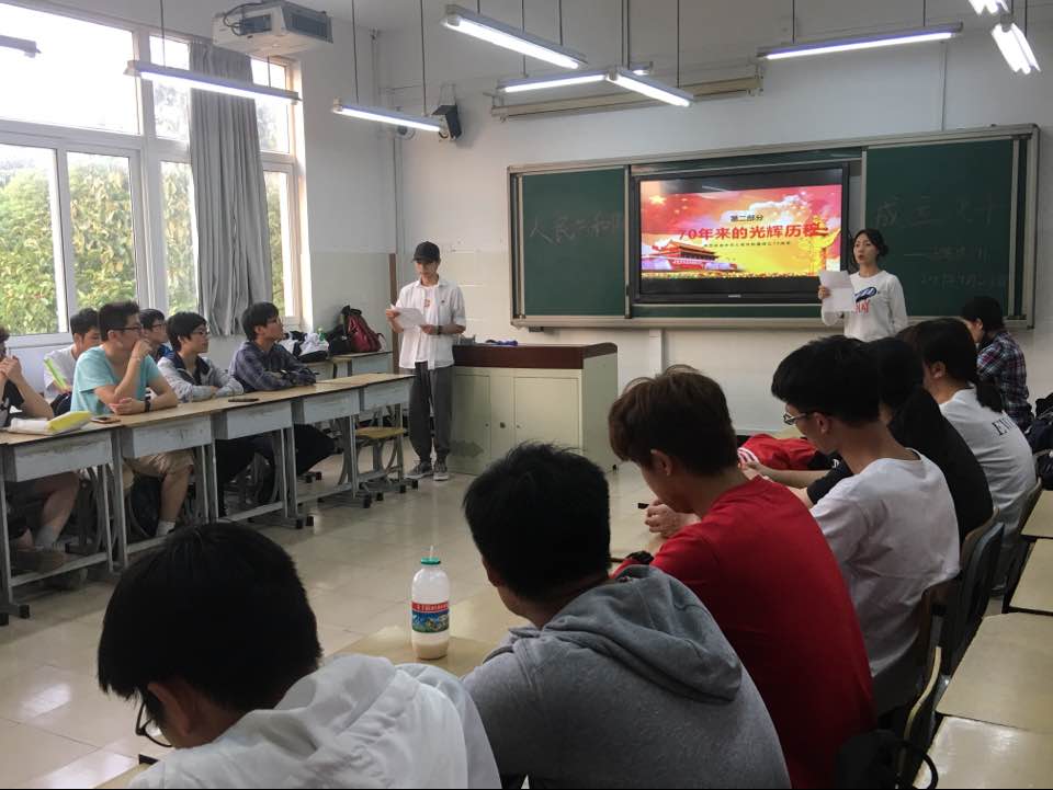 本次团日活动以全体学生高唱国歌——《义勇军进行曲》正式开始。首先,主持人以“沧桑巨变70年--开国大典”引出主题,接着,团支书刘淋同学、副班长诸溢璇同学以及学习委员韩晨同学分别就祖国70年来的光辉历程、伟大奇迹、历史启示进行了讲解,回顾了1949-2019这艰苦奋斗的70年,拉近历史的镜头,新中国成立之初,我们的家底薄得让人心酸:国民生产总值只有区区100多亿美元,重工业几乎为零,轻工业只是少数纺织业。然而,在这样一个满目疮痍、百废待举的“烂摊子”上,中国人民创造了从站起来、富起来、到强起来的人间奇迹。期间,同学们深刻的体会到了我们中国人民的伟大创造精神所造就的奇迹,也让同学们更加深刻得了解到如今美好生活的来之不易。最后主持人进行总结,在刘思贤、陆哲琰两位同学深情激昂的朗诵中结束了此次活动。