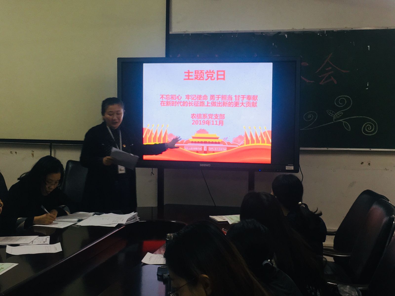 2019年11月9日13:00,农业信息工程系党支部在农信楼201会议室开展了“不忘初心 牢记使命 勇于担当 甘于奉献 在新时代的长征路上做出新的更大贡献”主题党日活动。会议由支部书记袁少英同志主持。会议主要议程包括: