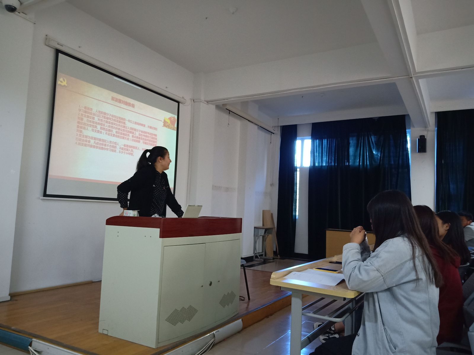 党支部书记袁少英老师讲到端正入党动机是争取入党的首要问题。入党的目的是什么?为什么要入觉?不是因为对个人的前途有利,也不是因为有9000万的党员队任而跟风入党,更不是通过入党来获取私利,而是怀着理想,热爱祖国的高尚目的。入党意味着要为人民过上美好的生活而努力奋斗,不怕吃亏,不怕牺牲。入党意味着要把作为生命个体的自我实现和党的事业结合起来。这是十分艰苦的过程,既然选择了、便只顾风雨兼程,坚定全心全意为人民服务的信念,自觉挑起实现的重担,为社会的发展献自己的推动力。为我们讲解了中国预备党员的条件,入党动机,以及如何做一名中国合格党员。