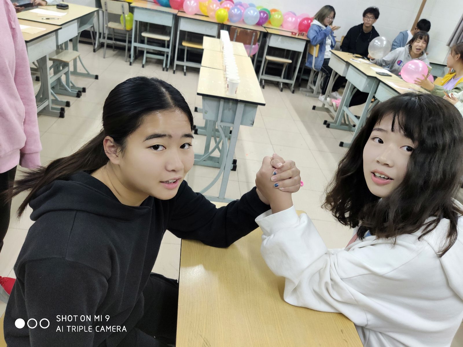 活动开始,以女生扳手腕展开,班级的女同学们都用着自己最有力的一面来打败对方,最有趣的是游戏失败后的惩罚,通过扳手腕活动和惩罚小游戏加深了同学们之间的了解,有助于加深感情,提升人际关系。