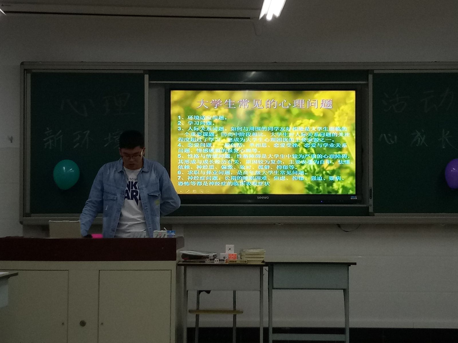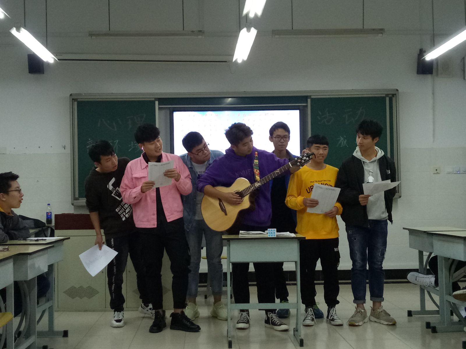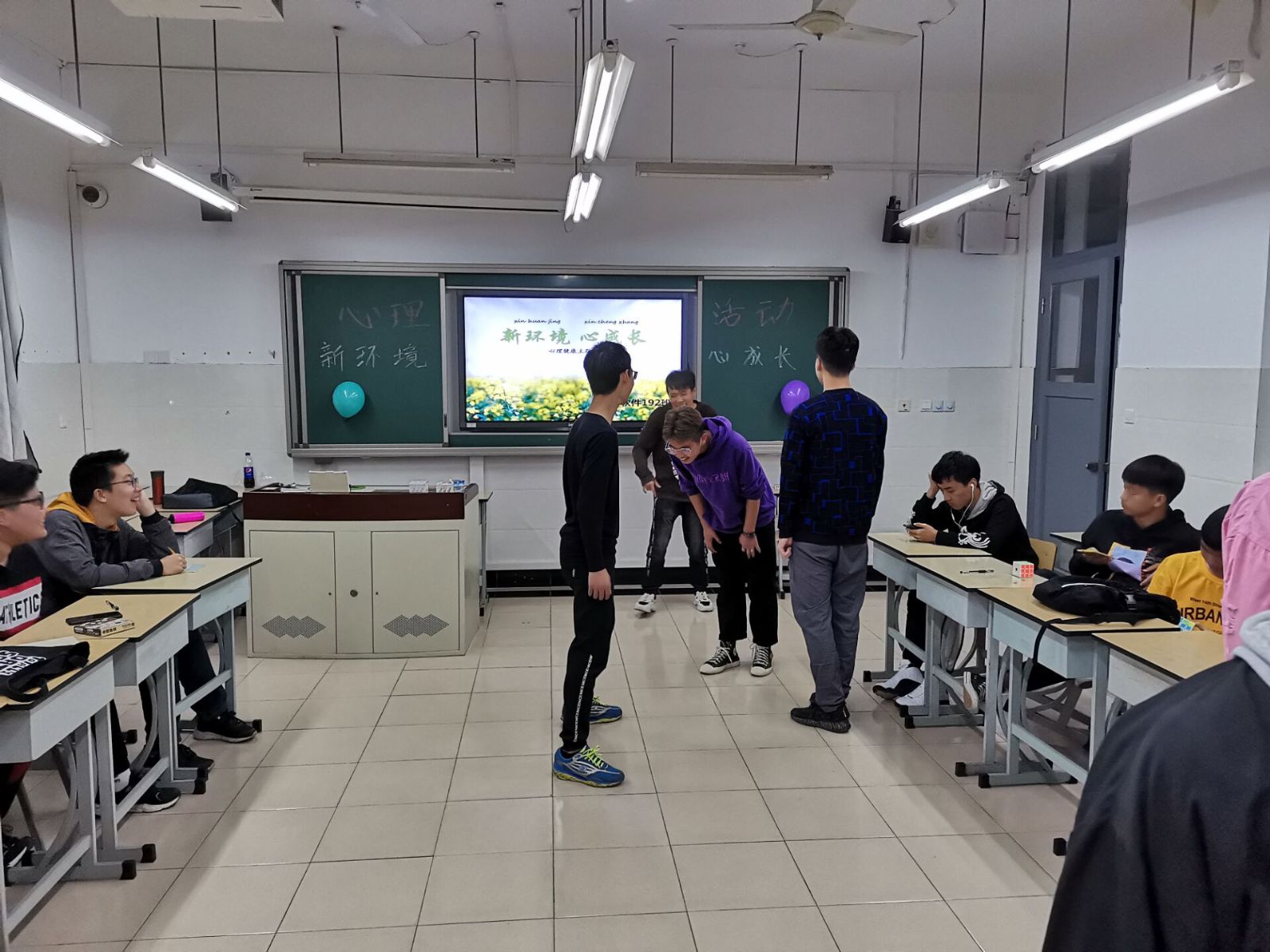 为了帮助学生了解心理健康知识,班级首先进行了心理知识普及,紧接着班级又开展了一系列小活动:心理电影推荐,心理小测试,你比我猜,萝卜蹲,谁是卧底,木头人这些活动活跃了现场气氛,有利于男女同学之间互相认识、交流与协作,加深了友谊,增进了同学感情,增强团体合作意识。活动进行到最后,由7名同学合唱的一首《老男孩》将活动推向了高潮,合唱结束后,由班级心理委员介绍了目前大学生经常遇到的一些心理困惑和解决方式,最后每位同学写了《写给未来自己的一封信》,三年之后再拆开看看是否实现自己的目标。