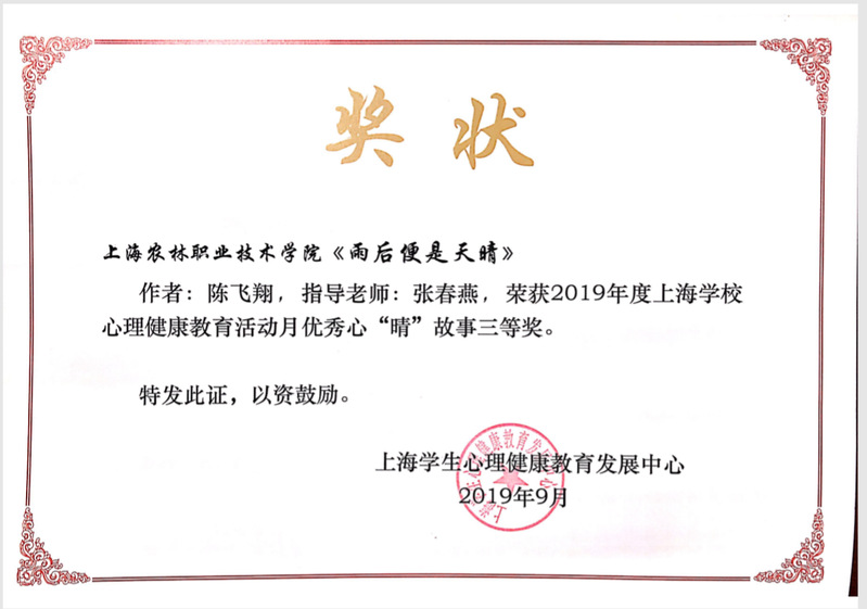 热烈祝贺由我系张春燕老师指导的陈飞翔同学的征文《雨后便是天晴》获2019年度上海学校心理健康教育活动月优秀心“晴”故事三等奖。