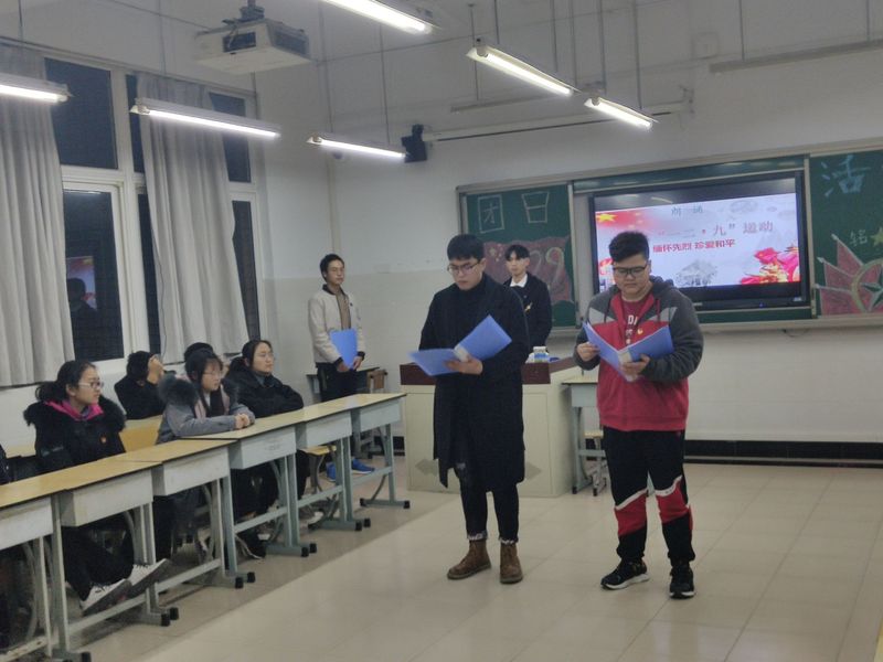 首先,我们观看了一二·九运动历史的视频,视频的内容向我们揭露了日本帝国主义侵略中国,并吞华北的阴谋,打击了国民党政府的妥协投降政策,促进了中国人民的觉醒。它配合了红军北上抗日,促进了国内和平和对日抗战。它标志着中国人民抗日民主运动新高潮的来到。看完视频之后,由我们班两位同学进行了关于一二九爱国运动的朗诵,朗诵的诗词中体现了同学们对祖国的热爱,对民族之难的缅怀之情。接下来就是我们班几位同学用深情的歌声抒发了他们自己不平凡的路程。唱歌之后进入到了我们小游戏环节——成语接龙。我们用一、二、九三个数字来作为开头进行成语接龙,游戏过程中虽然有卡壳,大家还是用自己所能想到的词汇,完成了游戏。最后由主持人做最后演讲并宣告此次团日圆满结束。