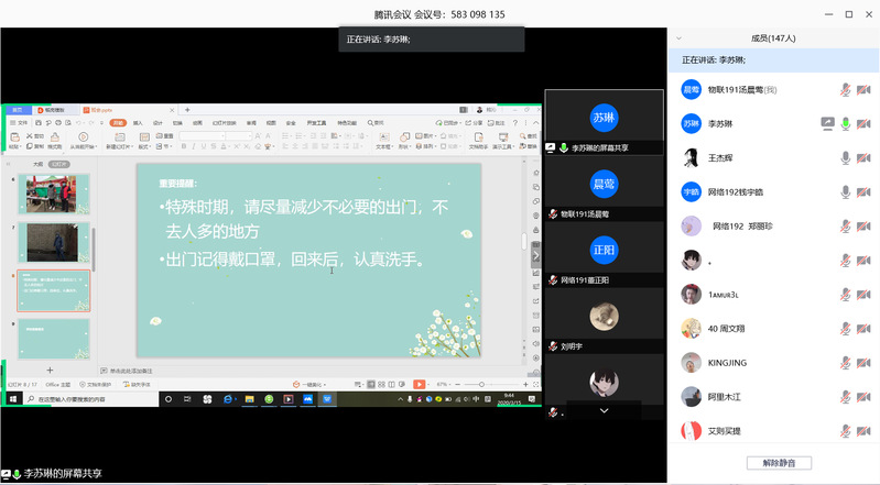 17级辅导员贾丽英通过班会给同学们传达了学校《关于进一步做好疫情防控期间顶岗实习工作的通知》,提醒同学们务必坚持安全第一原则,有序复工。条件不允许的同学可以利用这段时间进行“充电”,为复工做好准备。