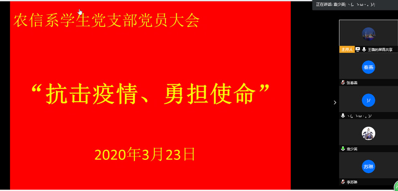 为深入学习贯彻落实习近平总书记2月23日在统筹推进新冠肺炎疫情防控和经济社会发展工作部署会议上的讲话精神和3月10日习近平总书记在湖北省考察新冠肺炎疫情防控的工作指示,农信系学生党支部于3月23日下午2点在腾讯会议上召开了全体党员大会,本次会议由学生党支部书记王璐主持,支部全体成员参加了本次会议。