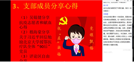 在抗击疫情期间,农信系学生党支部成员吴锟健参与到了一线防疫志愿服务工作当中,并在2月22日参加了“抗击疫情、为爱逆行”无偿献血活动,他在本次会议上讲到“我能做的不多,只希望可以尽自己一点微薄之力,为国家、为社会做一点贡献,相信在党中央的正确领导下,在全国人民的共同努力之下,我们一定能取得抗击疫情的最终胜利!”。教师党员张春燕表示“春暖花开,胜利在即,让我们携手抗击疫情,共同为祖国加油!”。学生党员嵇海豪也讲到“青年强则国强,作为年轻党员,我们要坚定不忘跟党初心、扎实自身本领,牢记青春使命。”支部其他成员也纷纷表达了自己对抗击疫情的美好祝福。