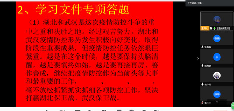 本次会议主要有5个议程,一是支部成员共同学习《习近平总书记在统筹推进新冠肺炎疫情防控和经济社会发展工作部署会议上的讲话》、《习近平总书记在湖北省考察新冠肺炎疫情防控工作指示》、《习近平总书记回信勉励北京大学援鄂医疗队全体“90后”党员》;二是利用学习强国专项答题内容考察支部成员学习成果;三是支部成员共同分享学习心得;四是支部成员表决心,即“疫情当前、勇于担当、站得出来、豁得出去。”;五是牢记习近平总书记嘱托:“坚定必将胜利的信心,不获全胜,绝不轻言成功。”