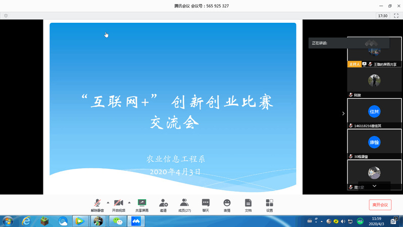为促进2020年“互联网+”创新创业比赛顺利开展,农信系于4月3日中午12点在腾讯会议召开了“互联网+”创新创业比赛交流促进会。农信系系主任孙修东、党总支副书记袁少英以及各参赛团队指导老师和学生参加了此次会议。