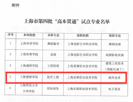 4月3日,市教委公布了“专科高等职业教育—应用型本科教育”人才贯通培养第四批试点专业名单(沪教委高〔2020〕24号),我院软件技术专业对接上海建桥学院软件工程专业,实行“高本贯通”。