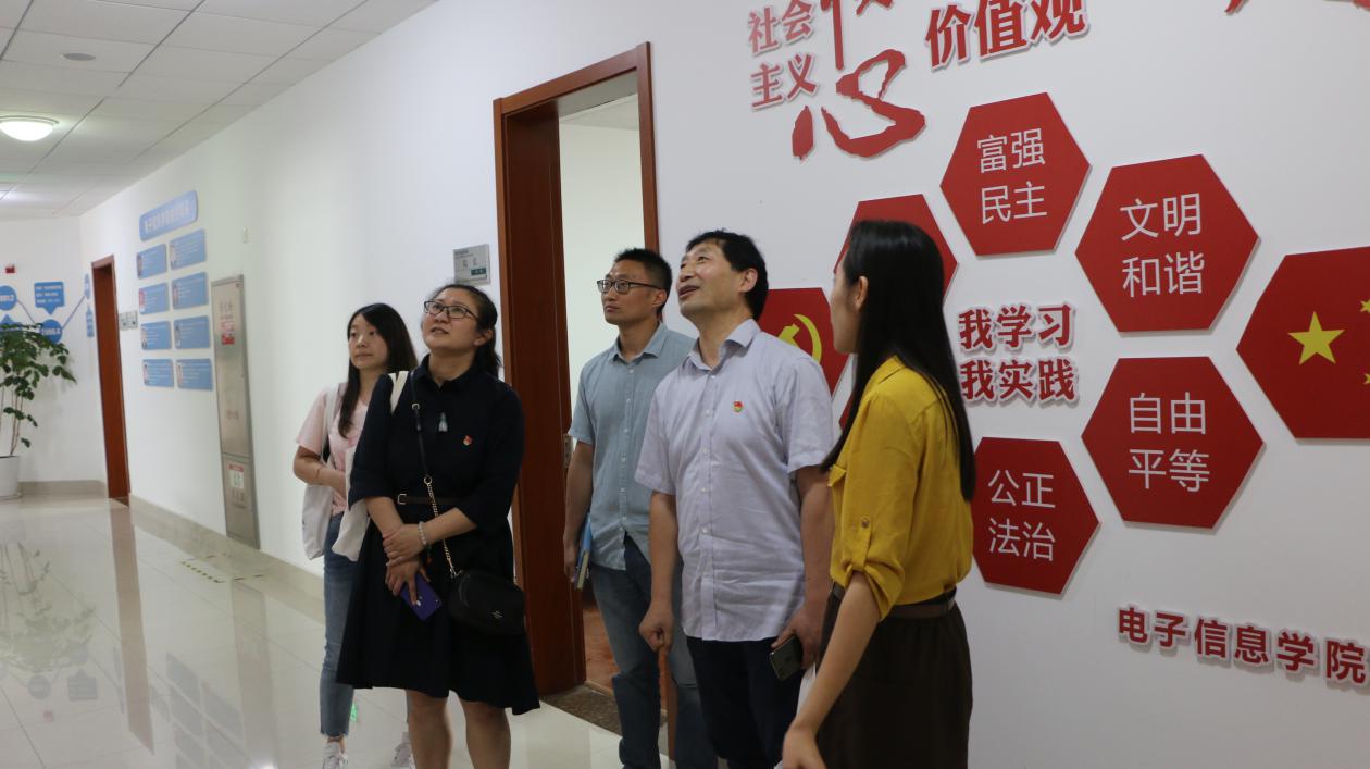 随后,电子信息学院党总支第四党支部书记高杉带领一行人,从支部亮点“信文化”展开介绍并参观文化走廊,一是“信仰”,党建引领,坚定方向;二是“信念”,科普科创,打造精品;三是“信心”,就业创业,再创佳绩;四是“信任”团学活动,凝心聚力;五是“信赖”,朋辈帮扶,助力前行;六是“信服”,下沉基层,精准调研;七是“信用”,资助育人,感恩回馈。