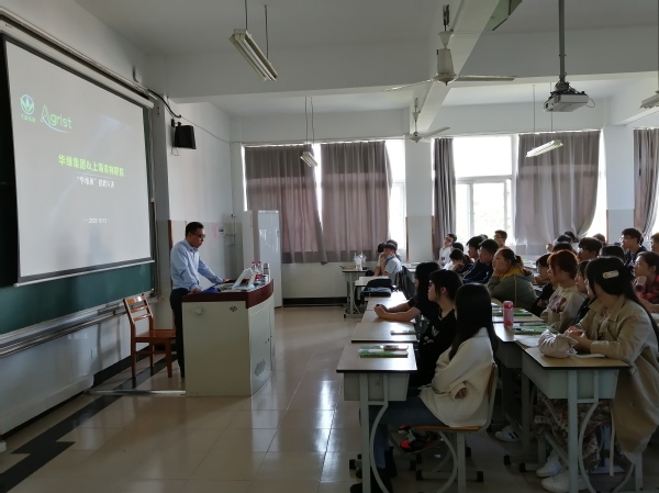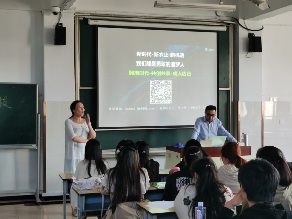 随后冉经理向学生详细介绍了本次招聘的人才需求、岗位信息和公司的福利待遇。本届“华维班”提供项目经理、种植技术员、客户经理、客服专员等多个不同类型岗位,涵盖农业种植技术服务、农业工程施工管理、农业设施装备研发、产品推广销售等不同就业方向,基本满足本专业学生的就业需求。对于入选“华维班”的学生,将提供导师一对一的指导和培训,帮助学生尽快掌握岗位专业技能,公司每月还将给予学生一定的实习补贴。最后,冉经理向大家播放了“学长寄语”和“董事长寄语”,全方位展示了公司的工作环境、工作内容和企业氛围,使大家对公司有了更进一步的认识。