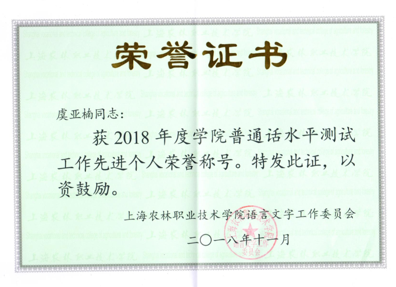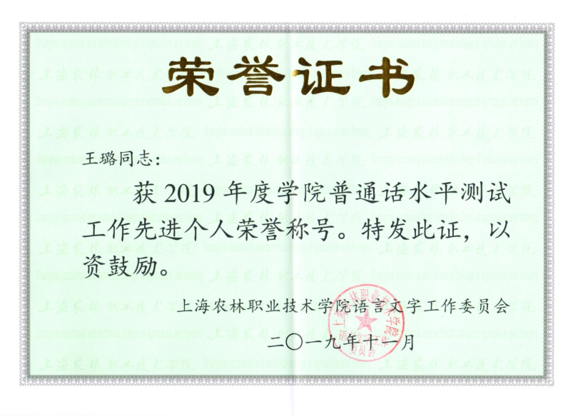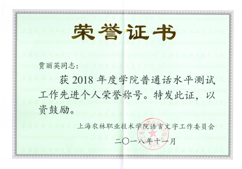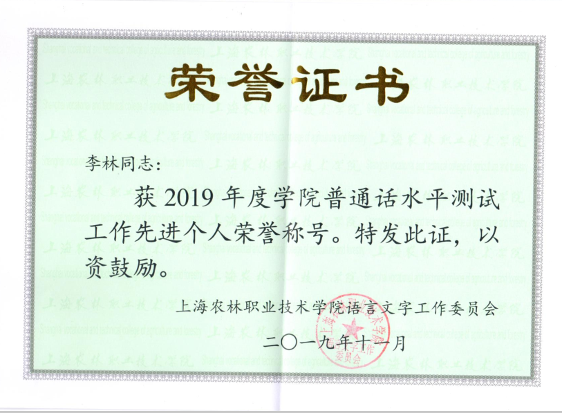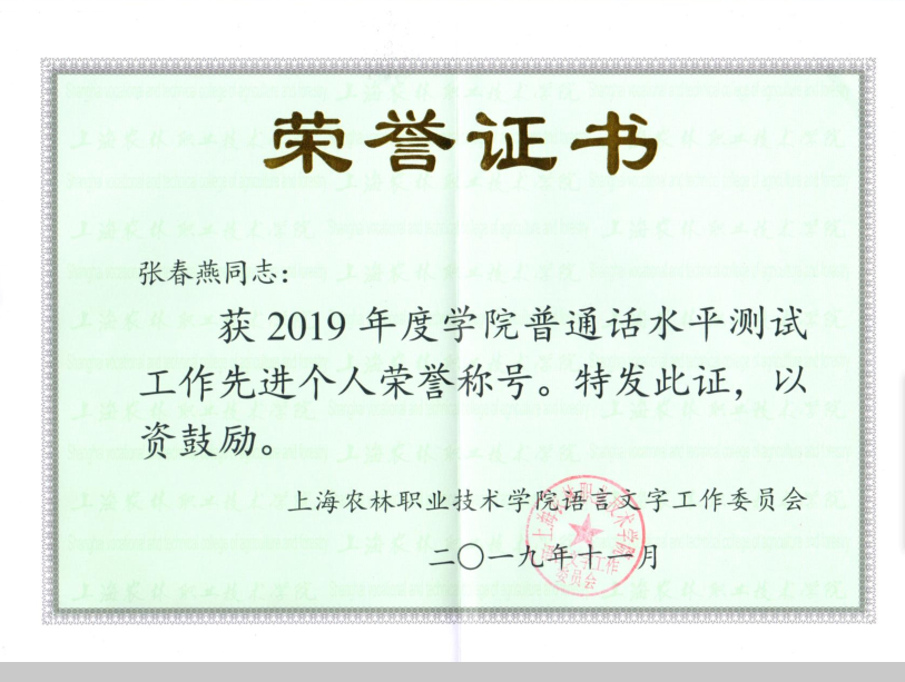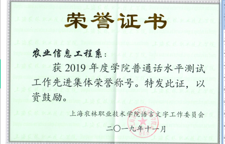 农信系高度重视语言文字工作,以普通话水平测试为抓手,用好第一课堂、第二课堂,推动师生讲普通话、用规范字。近日获悉,农信系荣获学院2019年度普通话水平测试工作先进集体荣誉称号。李林、虞亚楠、王璐、张春燕、贾丽英荣获学院2019年度、2018年度普通话水平测试工作先进个人称号。