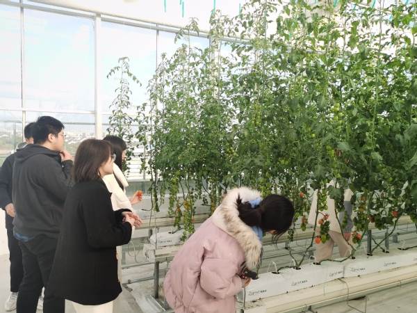 签约完成后,在华维公司讲解人员的带领下,5位“准学徒”还参观了公司的几大展示区。在华维公司建设的中国第一家灌溉博物馆,从秦汉时期的龙骨水车,到如今的全自动输水管网,从传统的陂渠塘井,到现代的节水灌溉新模式,大家充分感受到了中国数千年来灌溉史的演变以及现代灌溉技术的先进性。在华维公司新建设的全封闭屋顶温室,全套自研的物联网监测系统和灌溉系统精密运转,第一茬圣女果已经硕果累累。在公司庭院的休闲花园,各种立体栽培设施错落有致,展现了现代设施栽培的别样之美。