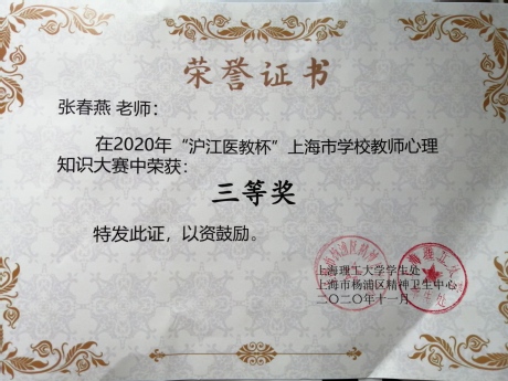 2020年11月下旬,在上海学校心理健康教育发展中心举办的“沪江医教杯”上海市学校教师心理知识大赛中,我校张春燕老师积极参加,荣获三等奖。