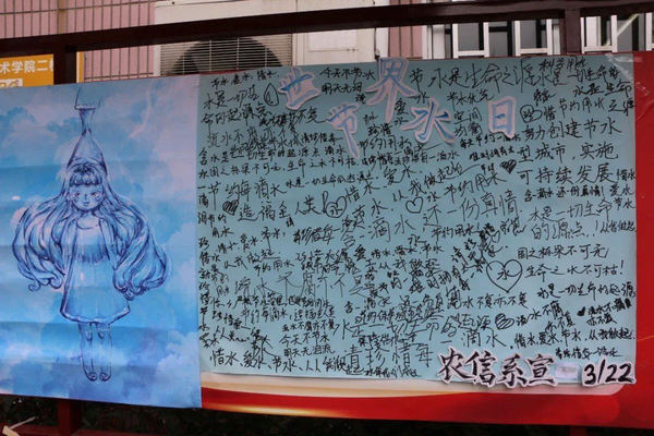农信系组织节水标语宣传活动。为迎接世界节水日的到来,进一步加强同学们节约用水的意识,营造良好的节水型校园氛围,3月18日下午,农信系在食堂门口组织了节水标语宣传活动,路过的同学们纷纷驻足留言呼吁全校师生加强对水资源的保护,节约用水,不让最后一滴水成为我们的眼泪。