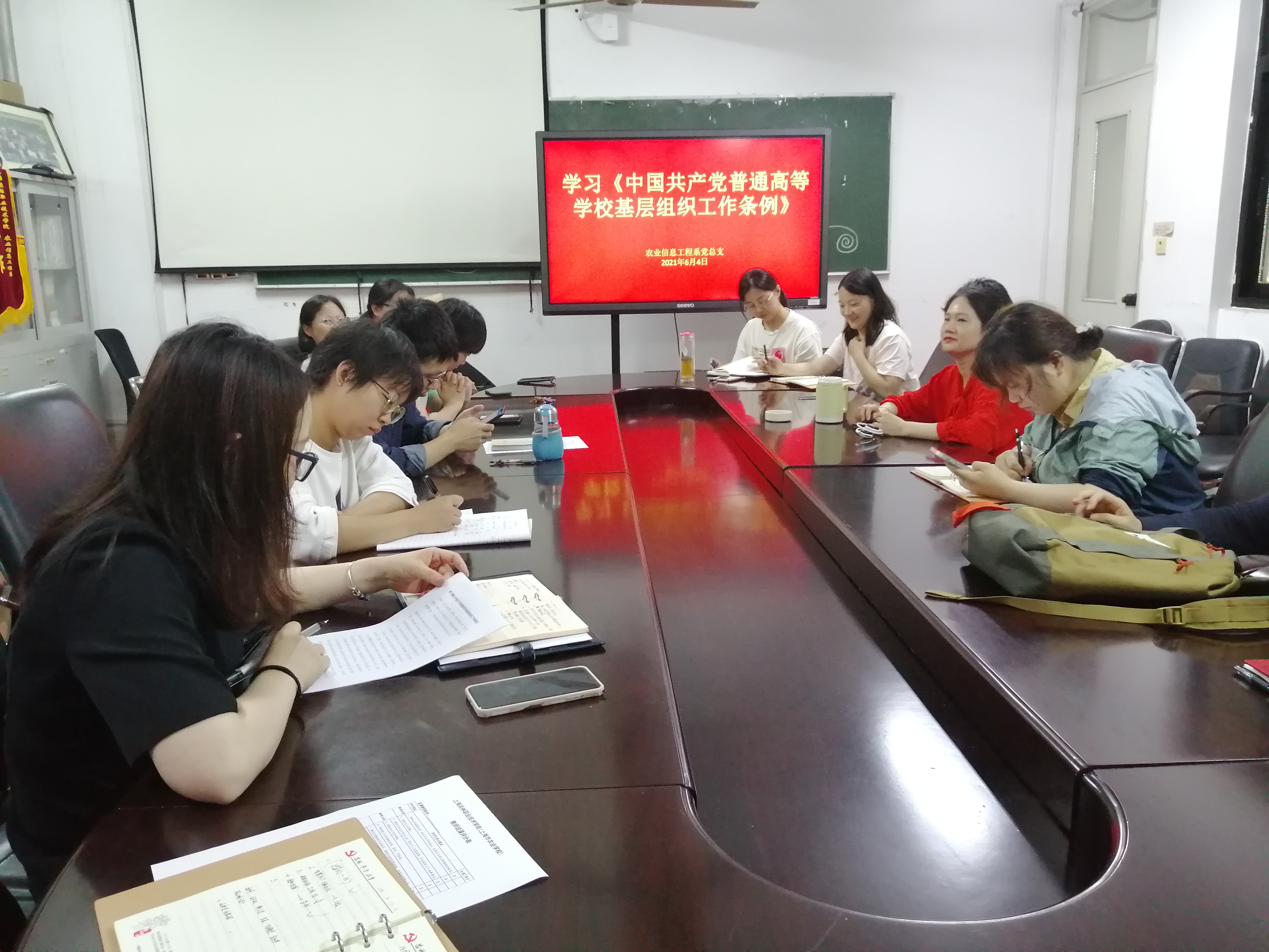 为全面提升新时代基层党组织工作质量,6月4日下午,农信系党总支在农信楼201会议室召开理论学习会,专题学习《中国共产党普通高等学校基层组织工作条例》。会议由农信系党总支副书记陆琳主持,全体党员参加。