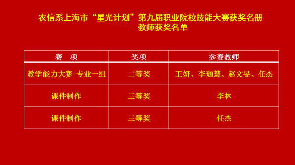 教师的教学能力大赛,王妍、李珈慧、赵文旻、任杰4位教师《设施农业生产技术》课程获得专业组二等奖。教师组技能大赛中,李林和任杰教师在“课件制作”项目中获得三等奖。