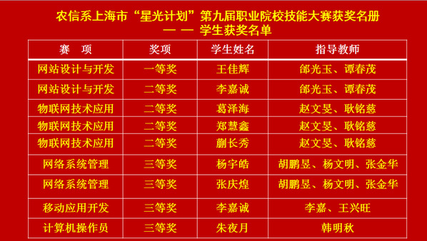 会上,首先通报上海市“星光计划”第九届职业院校技能大赛获奖名单,农信系师生在深化党史学习教育中凝聚奋进力量,以昂扬姿态开创各项工作新局面,立足专业,不断进取,在“网站设计与开发”、“物联网技术应用”、“网络系统管理”、“计算机操作员”、“教学能力大赛”、“课件制作”等六个赛项喜获佳绩。全系在本次学生组竞赛共斩获9个奖项,教师组竞赛共获3个奖项。获奖名单如下。