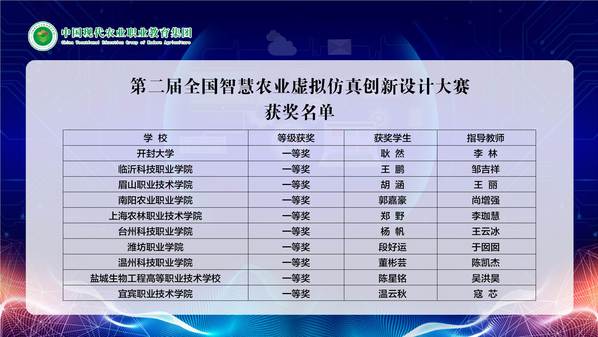 12月8日,由中国现代农业职业教育集团主办的“2021年第二届全国智慧农业虚拟仿真创新设计大赛——农业物联网项目规划与实施”颁奖典礼落幕,经激烈的角逐,智慧农业工程系设施农业与装备专业郑野获一等奖,闵鑫、陆李杰、陈诚、曹坤获二等奖,王鑫跃、姚家俊、章俊豪获三等奖,李珈慧老师获优秀指导老师。