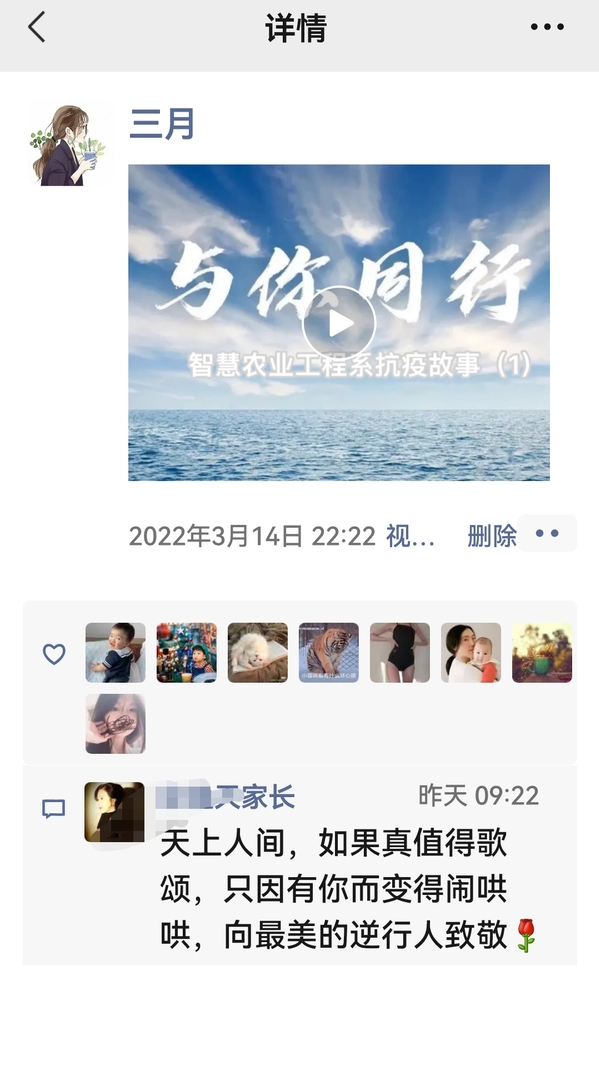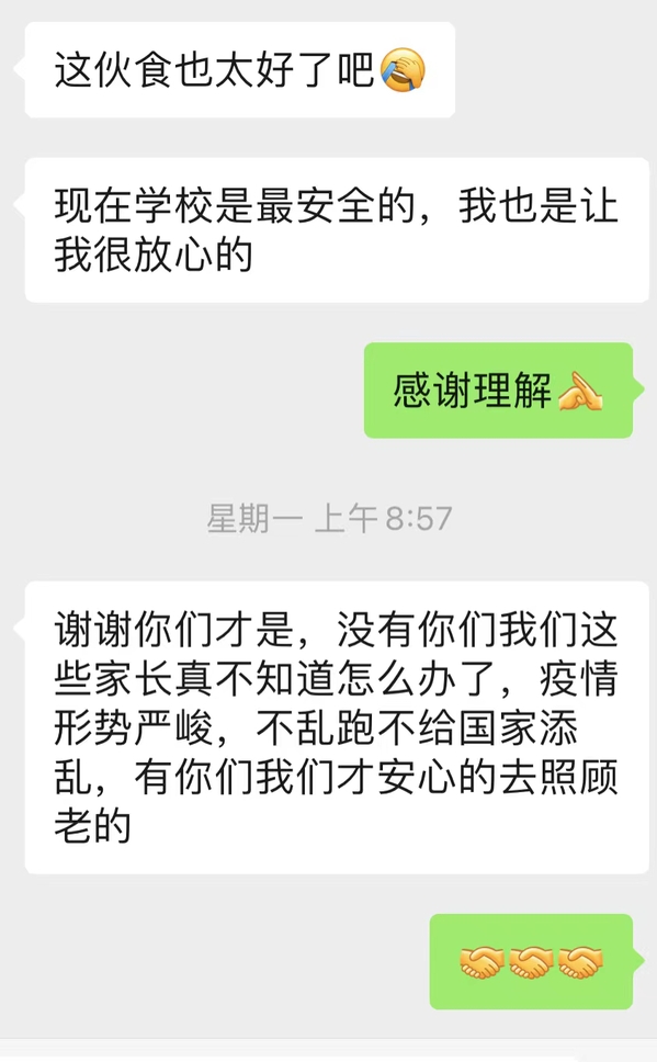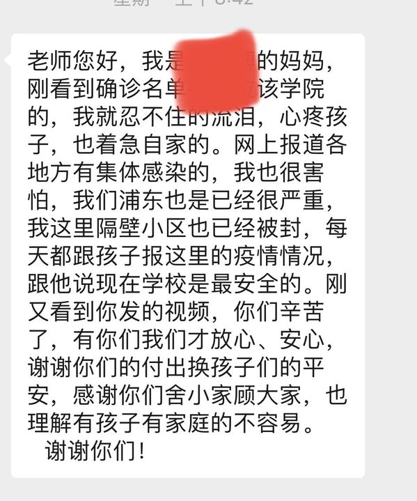 上午10:30驻扎在21号楼205的辅导员王璐收到家长的消息,家长询问学生在校期间的学习、生活、疫情变化等情况。王璐从学生的住宿、学生每日餐饮、疫情防控手势等方面耐心解答,家长表示上海疫情严峻,现在学校是最安全的,感谢学校的付出换来孩子们的平安,感谢学校教职员工舍小家、顾大家,以实际行动做最美逆行人。