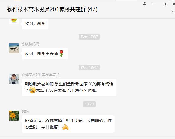 现在的同学们虽然想回家,更多的却是对这里的不舍与感动,感谢学校领导、老师、志愿者的辛勤付出,庆幸身在温暖的农林,今天通知同学们返校,家长们也是感慨:学生有老师们的守护,学校才是最安全的地方,老师们辛苦了!更有家长即兴起诗:“疫情无情,农林有情;师生团结,大白暖心;唯盼全阴,早日驱疫!”