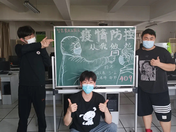 3月12日-3月17日学生住宿区网格化管理临时党支部成员谢伶俐、王妍入驻农信楼,他们的到来给农信楼更是增添了几分家的感觉,他们为走读学生分发生活必需品、每晚查寝组织同学们有序就寝。并举办了“疫情防控,从我做起”主题黑板报展示活动,帮助同学们树立战役必胜的信心。